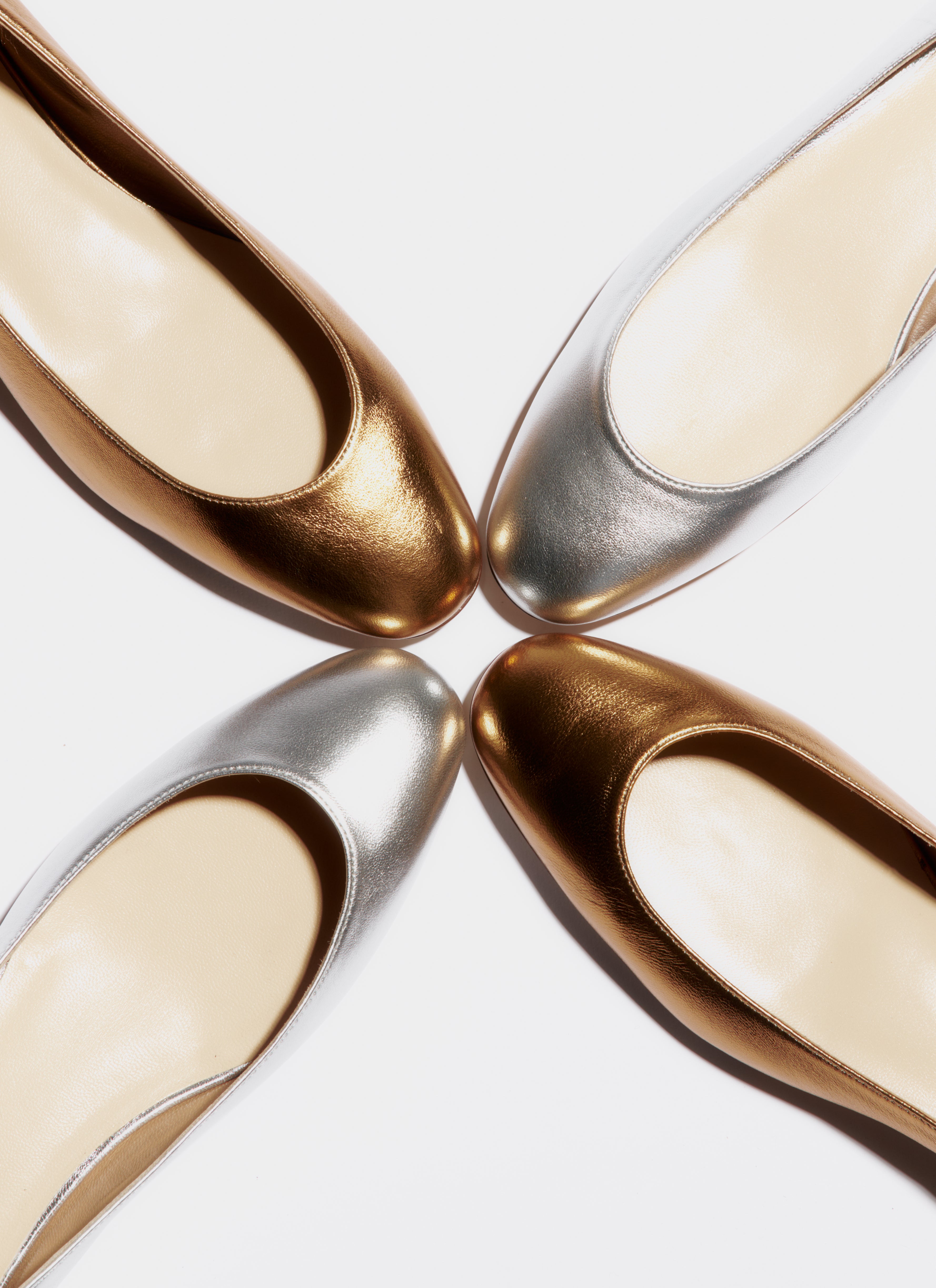 Round toe low vamp ballerina in nappa laminated leather, heel height 10mm.