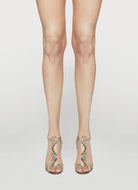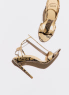T-bar sandal with covered elastic in tan watersnake leather, heel height 105mm.