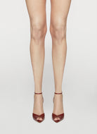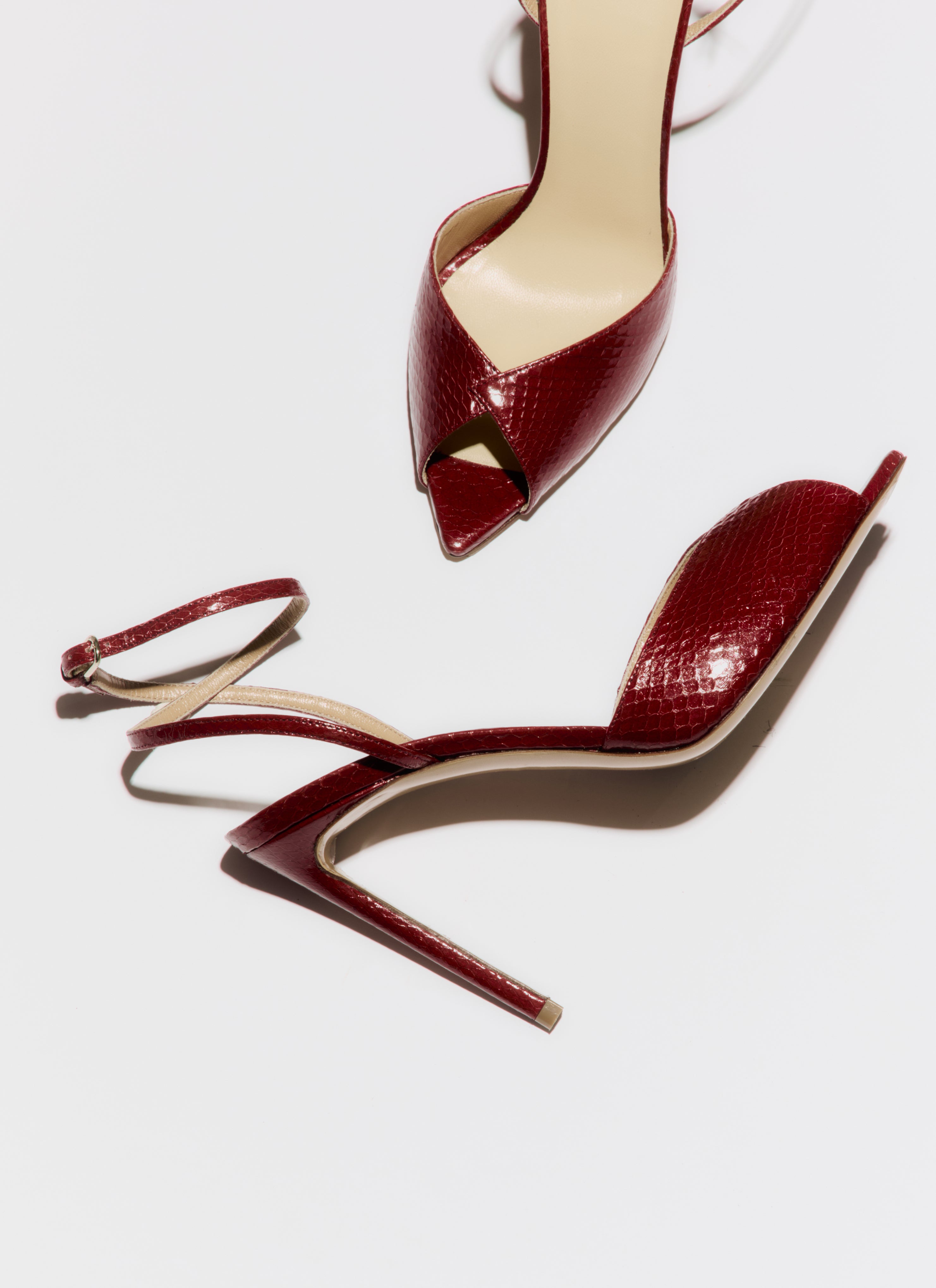 Ankle strap peep toe sandal in lux watersnake, heel height 105 mm.