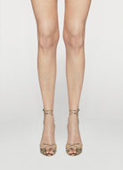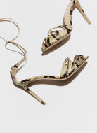 Laced sandal in tan matt watersnake, heel height 95mm.